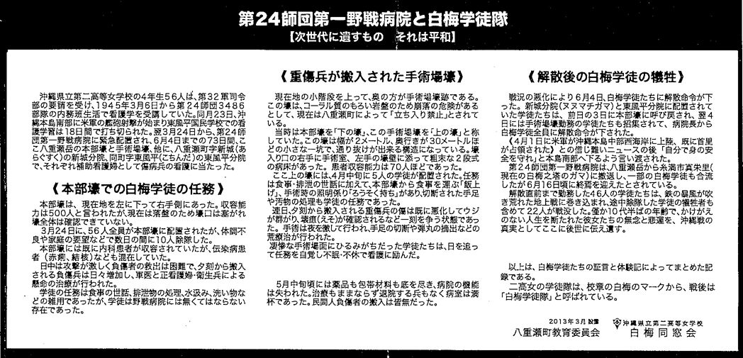 1945年3月6日、東風平国民学校に開設されていた第24師団看護教育隊に4年生56人が入隊。内務班生活で看護学を受講する。